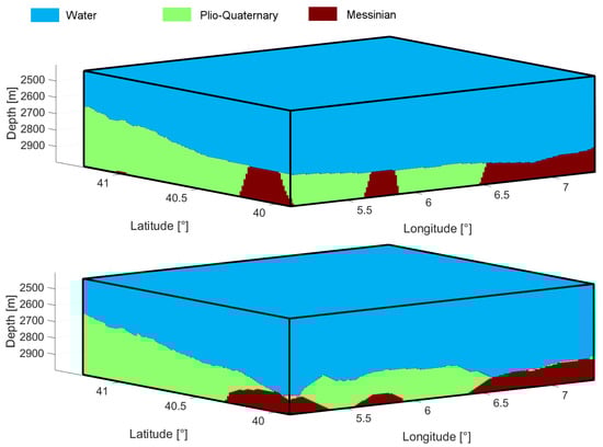 The inversion method is based on the discretization of the studied volume into voxels that, under the assumption of planar approximation, correspond to right rectangular prisms. It is important to note that the planar approximation, while not strictly mandatory for the inversion algorithm, is employed to minimize computational time and is reliably applicable even for extensive regions such as the entire Mediterranean Sea area. Empirical algorithms to determine the suitability of this approximation given the study area are described in [3,9]. For each of these voxels, two unknown parameters are identified, namely the label and the density. The former is a discrete categorical variable that is used to identify the geological unit (e.g., sediment, salt bodies, continental crust, oceanic crust, upper mantle, etc.). The latter is a continuous variable that identifies the voxel density value. Before performing an inversion, the first operation is the definition of a starting 3D model in terms of labels and densities for each element of the volume. This means exploiting all available regional studies, maps, seismic images, well logs, etc., to set the 3D structural model. Since this inversion is based on a probabilistic approach, it is also necessary to provide information about the uncertainty of the labels and density models. For the labels, the uncertainty defines the possible areas in which lithological changes could happen, and their probability distribution is mathematically formalized with an exponential function, with the parameters depending on the initial knowledge of the area. The density is instead supposed to be normally distributed, and so for each voxel, apart from the average density value, a corresponding standard deviation (STD) to set the admissible ranges of variability is assigned. More details on the probability distributions can be found in [5].