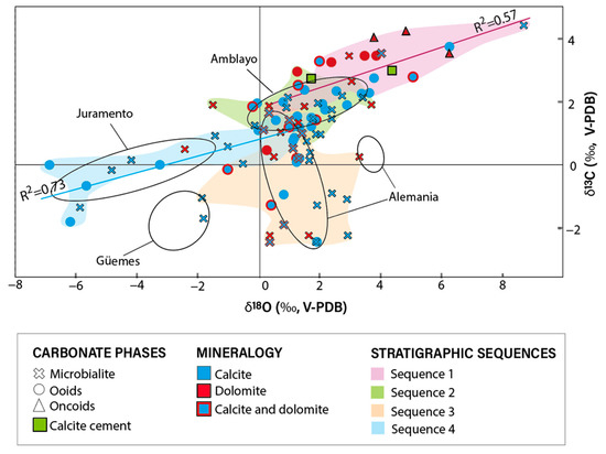 - Marquillas, R.A.; Sabino, I.; Sial, N.A.; Del Papa, C.; Ferreira, V.; Matthews, S. Carbon and oxygen isotopes of Maastrichtian-Danian shallow marine carbonates: Yacoraite Formation, northwestern Argentina. J. S. Am. Earth Sci. 2007, 23, 304–320. [Google Scholar] [CrossRef]