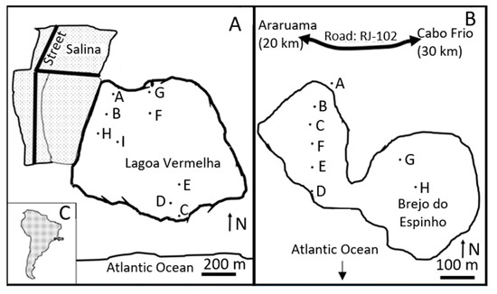 Figure 1. Lagoa Vermelha (A) and Brejo do Espinho (B) are close to the shoreline of the Atlantic Ocean and approximately 120 km east of Rio de Janeiro, Brazil (C). The letters show the locations of each drilled core (see Supplementary Materials).