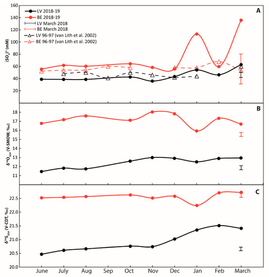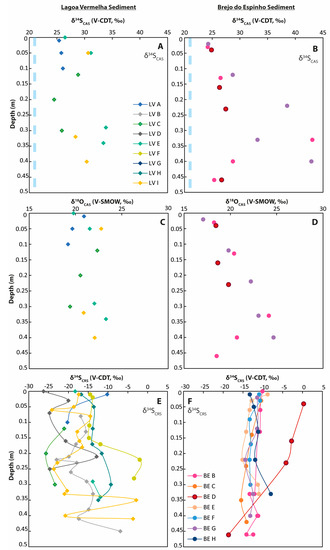 Figure 3. Annual cycles of surface water in Lagoa Vermelha (black signatures) and Brejo do Espinho (red signatures) samples from different locations collected in March 2018 are comprised in the black and red brackets. (A) Sulfate concentrations. Data from [29] are in broad agreement with the present data; (B) δ18O values of dissolved sulfate from surface water; (C) δ34S values of dissolved sulfate. Error bars represent the external reproducibility (2 S.D.).