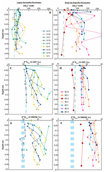 Figure 4. Pore-water data from different cores taken from Lagoa Vermelha and Brejo do Espinho. The light blue dashed lines represent the respective seawater values. (A) Sulfate concentrations in Lagoa Vermelha; (B) sulfate concentrations in Brejo do Espinho; (C) δ34S of dissolved sulfate in Lagoa Vermelha; (D) δ34S of dissolved sulfate in Brejo do Espinho; (E) δ18O of dissolved sulfate in Lagoa Vermelha; (F) δ18O of dissolved sulfate in Brejo do Espinho.