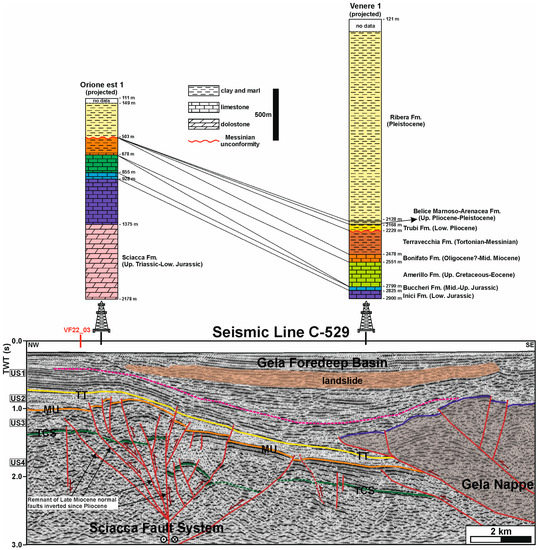 Interpretation of the NW−SE-oriented multichannel seismic reflection profile C−529, located a few kilometers off the Sicilian coast between Capo San Marco and Sciacca (position in Figure 2) and crossing the high-resolution seismic profile VF22_03 in its northern part. This seismic line shows the tectonic setting of the Sciacca offshore, characterized from NW to SE by the NNE−striking left−lateral transpressive Sciacca Fault System, the Gela Foredeep Basin, and the Gela Nappe. The exploration wells Orione Est 1 and Venere 1 (see position in Figure 2) were used to calibrate the interpretation. The first 100 ms of seismic data are lacking along the seismic profile. Abbreviations: MU: Messinian unconformity; TCS: Top of the carbonate succession; TT: Top of the Trubi Fm.; US1: seismo-stratigraphic Unit S1 associated with the upper Pliocene–Pleistocene succession including Ribera and Belice Marnoso-Arenacea formations; US2: seismo-stratigraphic Unit S2 associated with the lower Pliocene Trubi Fm.; US3: seismo-stratigraphic Unit S3 mainly associated with the Tortonian–lower Messinian Terravecchia Fm.; US4: seismo-stratigraphic Unit S4 associated with Mesozoic–Cenozoic carbonate succession. The magenta dashed line within the Unit S1 (US1) succession is an unconformity produced by tectonic activity along the Sciacca Fault System.