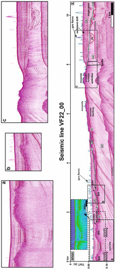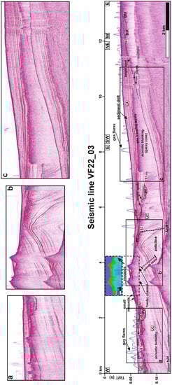 Fluid seeps from the seafloor are numerous along all seismic lines (Figure 5, Figure 6 and Figure 7), but no samples are available. These seeps produce detectable amplitude anomalies in the water column known as flares (e.g., [67,68,69,70,71,72,73,74,75,76,77,78,79,80]), which can be detected.