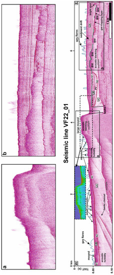 The six high-resolution seismic profiles acquired in the Capo San Marco–Sciacca offshore area (Figure 2) run on the continental shelf at a water depth between 20 m and 50 m. In the central part of the seismic profile VF22_01, a prominent bank rises to a 12 m water depth. The seismic profiles image the sedimentary succession beneath the seafloor up to about 60 m (65–70 ms TWT), assuming an average interval velocity of 1700 m/s. The interpretation of the three more significant profiles (VF22_00, 01, and 03) has been reported in this paper.