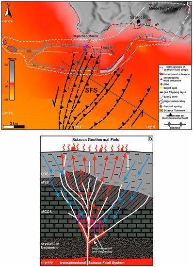 (a) Map showing the location of the main fluid-related features identified along the high–resolution seismic profiles (thin white lines) in the Capo San Marco–Sciacca offshore area and the position of the positive flower structure associated with the NNE–striking left-lateral transpressive Sciacca Fault System (SFS) interpreted along MCS line C–529 (thin grey line) (see Figure 3 for interpretation). The location of the main thermal springs and Sciacca Thermae is also indicated. The white dotted curve represents the documented onshore–offshore extent of the Sciacca Geothermal Field based on the data presented in this paper. Morpho-bathymetric data from the EMODnet Bathymetry Portal (http://emodnet-bathymetry.eu/) Digital Terrain Model (1/16*1/16 arcmin grid resolution) and multibeam data acquired by OGS. (b) Schematic model showing the plausible mechanism for the formation of the Sciacca Geothermal Field. This field has developed in a tectonically active zone dominated by the left–lateral transpressive structures associated with the lithospheric, NNE–striking SFS. The presence of these faults may have favored the rising of magma (in red) and fluids (magenta arrows) from the mantle in the Capo San Marco–Sciacca offshore area and the consequent heating of groundwater (blue arrows), leading to the formation of a geothermal resource contained in the Triassic carbonate succession outcropping on the Monte San Calogero. Theis cold water (red arrows) rises to the surface. Abbreviations: MCCS: Mesozoic–Cenozoic Carbonate Succession; MSS: Miocene Siliciclastic Succession; PQS: Pliocene–Quaternary Succession.