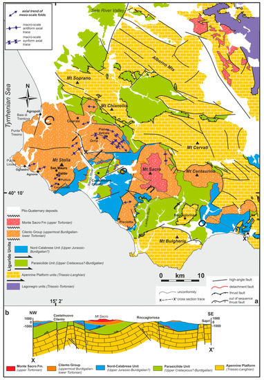Figure 2. (a) Geological map of Cilento; (b) geological cross-section (modified after [8]).