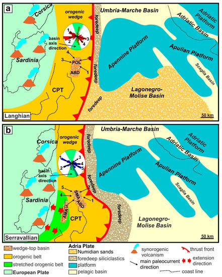 Figure 11. Paleogeographic maps of the central sector of the Mediterranean area in (a) Langhian and (b) Serravallian. Numbers in the rose diagrams and paleogeographic maps indicate the corresponding main paleocurrent directions.