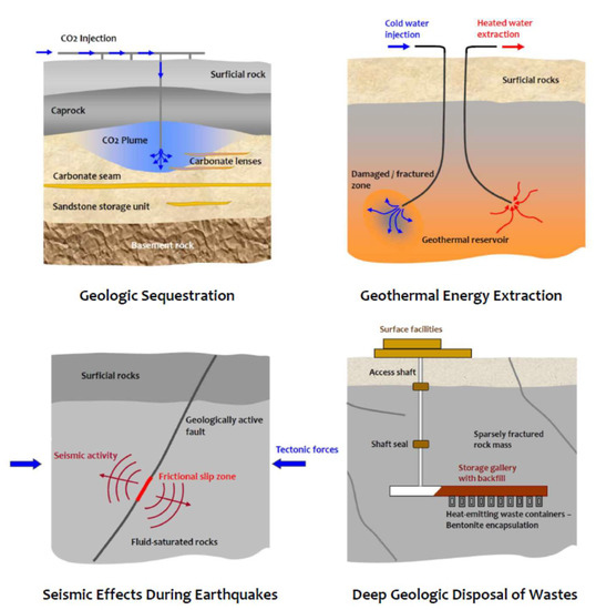 In their natural setting, geologic media are rarely intact, defect-free rock formations. Defects such as fractures, both sparse and high density, intrusions created during the formation of the rocks, fractures created during injection and extraction activities, heterogeneities and other defects at various scales can influence the bulk fluid flow behaviour, particularly in a large-scale geological horizon. In their natural setting, geologic media are rarely intact, defect-free rock formations. Defects such as fractures, both sparse and high density, intrusions created during the formation of the rocks, fractures created during injection and extraction activities, heterogeneities and other defects at various scales can influence the bulk fluid flow behaviour, particularly in a large-scale geological horizon. Typical areas of application are illustrated in Figure 1. With such observations, it is natural to enquire whether the permeability of an intact rock has any relevance to the geosciences. On the contrary, intact permeability can influence the behaviour of fluid transport characteristics at the scale of a fracture where the migration of fluids permeating isolated fracture extremities or stagnant zones can be controlled by the permeability of the intact geologic medium (Figure 2).