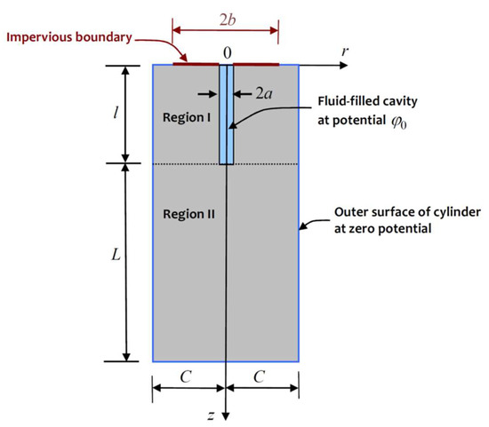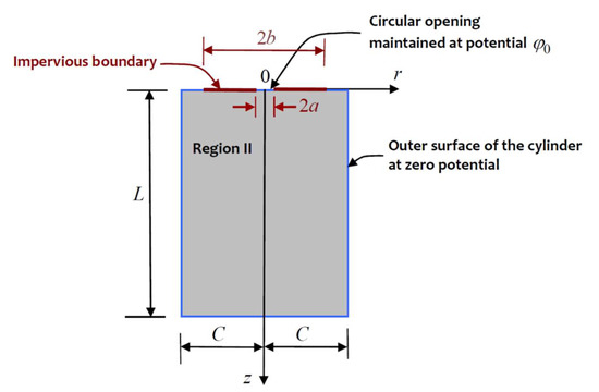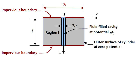 The approach adopted in this study is to obtain approximate solutions that can be used to estimate the flow from the cylindrical cavity that is maintained at a constant potential and where the outer boundary of the cylinder is maintained at zero potential. One approach is to assume that the entire upper surface of the cylinder and the common boundary between Regions I and II are subjected to null Neumann boundary conditions (Figure 5). Invoking this assumption introduces a state of radial symmetry in the potential problem and reduces the partial differential Equation (1) to an ordinary differential equation in , which can be solved, subject to the boundary conditions and . Omitting details, it can be shown that the total flow through the domain can be expressed in the form