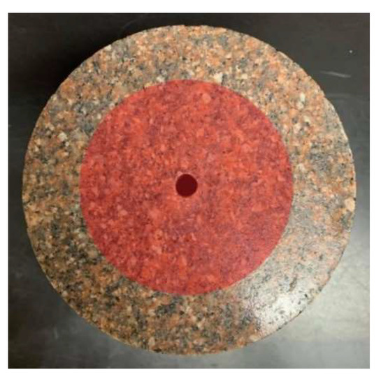 The sealed region (indicated in red) of the surface of the 150 mm diameter granite cylinder measuring with a cavity diameter of 10 mm.