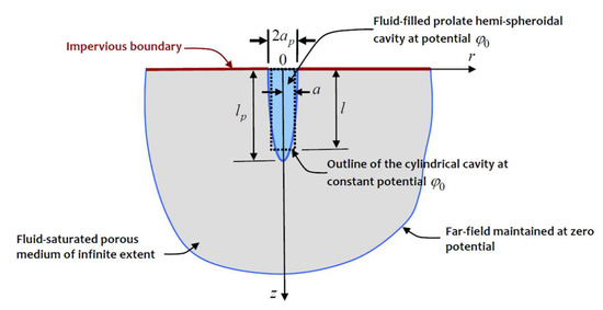 where Sp is the boundary of the prolate spheroidal cavity that is subjected to the constant potential and n is the outward unit normal to Sp. Evaluating the integral (24), we can obtain an expression for the flow rate from the complete prolate spheroidal cavity with semi-minor axis ap and semi-major axis lp subjected to a boundary potential. Since the plane of symmetry corresponds to a null Neumann boundary condition, the results for the flow rate from the complete prolate spheroidal cavity give the flow rate from the prolate hemispheroidal cavity shown in Figure 7, i.e.,