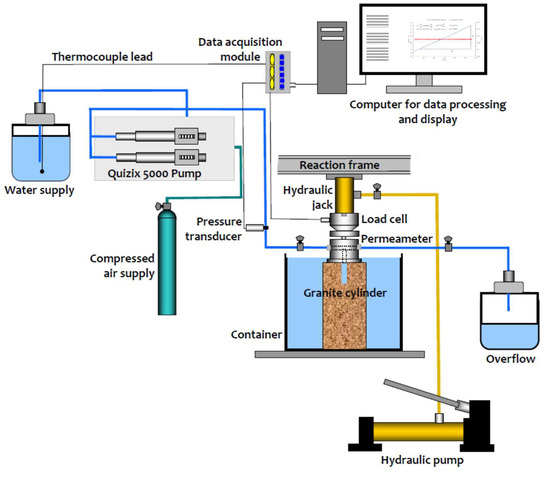The need for transient flow methods to estimate the fluid transport properties of low permeability rocks was recognised in the pioneering article by Brace et al. [22]. Other contributions relevant to transient tests are also given in [23,24]. Transient techniques are complicated because other properties relevant to the interpretation of the tests have to be determined, including the compressibility of the porous skeleton, the compressibility of the solid material composing the porous skeleton, the compressibility of water, the porosity of the porous medium, the Biot coefficient the air voids that can be present in the fluid region that is pressurised to attain the transient flow, and the appropriate mathematical formulation and modelling (i.e., the diffusion equation approach or a poroelasticity approach) used to interpret the experiments [25,26,27,28,29,30,31,32,33,34,35,36,37]. With the advent of high-precision pumps that can provide flow rates as low as 0.000070 mL/min, steady-state experiments can be performed on low permeability materials such as the Cobourg limestone and the granites from the Canadian Shield. In the case of the Cobourg limestone, the effective permeability of a region measuring 80 mm × 120 mm × 130 mm was estimated using experimental and computational approaches to obtain an isotropic permeability in the range . Similarly, steady-state flow patch permeability tests were performed to determine the effective isotropic permeability of cuboids of Lac du Bonnet granite and Stanstead granite, measuring 300 mm and 280 mm, respectively, from the western and eastern flanks of the Canadian Shield [38]. The geometric mean-based permeability ranged from for the Stanstead granite to for the Lac du Bonnet granite. The brief review presented in this section is not intended to be a comprehensive review of the topic of permeability measurement of rocks; however, the recent key articles that address novel experimental and theoretical developments are instructive.