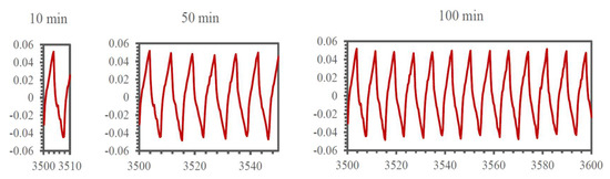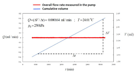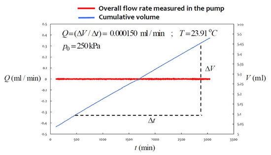 The permeameter provides a cavity radius of 5 mm and sealing is established by applying an axial load to the permeameter; the sealing pressure is 2.5 MPa over an annular region with an internal radius of 12.5 mm and external radius of 50 mm. It is noted that a sealing stress of approximately 2.5 MPa is sufficient to reduce any interface leakage to within 0.1% of the cavity pressure that induces steady flow. It is natural to enquire whether the application of the sealing stress can contribute to the closure of micro-cracks, defects and pores in the Lac du Bonnet granite. To the author’s knowledge, the blocks of the Lac du Bonnet granite supplied were defect-free, although the only way of assessing this is to perform CT scans on the core that was tested. The elastic modulus of the Lac du Bonnet granite was in the range of 70 GPa [33]. Therefore, pore closure during the application of a sealing stress of 2.5 MPa will not be an issue in the current tests. An alternative procedure that involves completely bonding a stainless-steel plate to the plane surface of the cylinder is also a possibility provided that no movement of the location of the annular sealing region is contemplated. The axial sealing load is measured using an Interface Model 1200 Load Cell with a load capacity of 50 kN. The steady flow to the cylindrical cavity region is provided by a Quizix 5000 Precision Pump; flow rates can be varied between 0.000070 mL/min and 30 mL/min. The sample containing the partially drilled central cavity is first saturated using a venturi vacuum saturation technique at −10 kPa, with periodic adjustment of the water level in the saturation chamber to facilitate extraction of air from the unsaturated regions. Periodic weighing of the sample is also conducted to ensure that the saturation procedure is effective. Once the vacuum saturation is complete, the saturation is compared with the porosity estimates. In general saturation levels of approximately 98% can be achieved using the variable height reservoir arrangement. Attainment of 100% saturation requires the application of a greater vacuum, which can also lead to pore compression and alterations to permeability. A 98% level of saturation is considered to be acceptable for steady-state permeability tests and corrections are needed to account for the air void fraction if transient tests are contemplated. The cavity pressure inducing steady flow in the granite cylinder is measured via a Honeywell pressure transducer (Model TJE CP 300 psi). The fluid used in the permeability tests was normal tap water at a room temperature of approximately 24 Deg C. The steady flow rate from the cavity is the important experimental information that enables the estimation of the permeability of the Lac du Bonnet granite. Even though the pumps can supply very low flow rates, the reciprocating action of the pump operation can lead to fluctuations in the recorded pressure. The estimation of the actual flow rate is, however, best achieved by using the volume flow over a prescribed time interval. Since the variation in the cumulative volume with time is steady, this data can be used to estimate the flow rate. Typical examples of the Quizix 5000 Precision Pump records that indicates the cumulative volume with time are shown in Figure 10, Figure 11 and Figure 12 and this information is used to calculate the flow rate under a given inlet pressure. Figure 13 indicates, for purposes of illustration, enlarged views of the flow rates for typical time intervals.