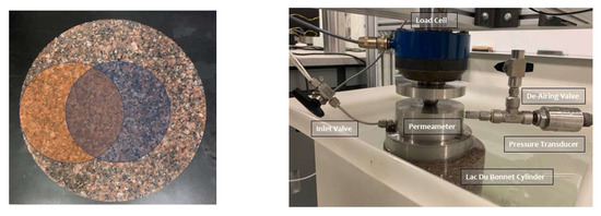 The experiments conducted involved the initiation of steady flow from a central cylindrical cavity (diameter 10 mm and length 50 mm) located in a cylinder of Lac du Bonnet granite (150 mm in diameter and 300 mm in length). The granite cylinder was cored from a cuboidal block of Lac du Bonnet granite measuring 500 mm × 500 mm × 350 mm, which was supplied by Cold Spring Granite Ltd., in Pinawa, Manitoba. The plane surfaces of the cylinder were machine polished, allowing for the development of a sealed surface for the placement of the patch permeameter developed by Selvadurai [57]. This type of permeameter was successfully used to measure the effective permeability of an Indiana limestone cuboid measuring 508 mm [18] and a cuboid of Lac du Bonnet granite measuring 300 mm [38]. A schematic view of the experimental configuration is shown in Figure 9.