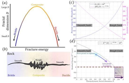 The figure presents a comprehensive analysis of the dependence of the fractal dimension on material composition and regime. (a) Schematic representation illustrating how the fractal dimension varies according to different material types. Brittle and ductile materials exhibit smoother crack surfaces, while composite materials have a larger fractal dimension; (b) Schematic representation of the relationship described in (a); (c) Demonstrates the interplay between available energy (magenta line) and fracture energy (blue line), both influenced by the thermodynamic fractal dimension; (d) Analytic depiction of the residual energy, which is the difference between available energy and fracture energy, as a function of the thermodynamic fractal dimension.