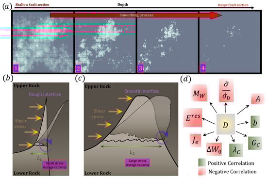 Equation (9) does not directly address the concept of fault smoothing or roughness. However, it can draw a connection based on the underlying mechanisms. For example, the fractal dimension is proportional to the logarithm of the roughness: []. Equivalently, . This in Equation (8) leads to being written in function of as . In that sense, the increase of geometrical roughness implies the increase of fractal dimension and the increase of as shown Figure 2c (blue line). This into Equation (9) leads to Equation: