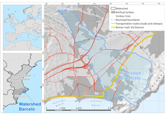 From an anthropic point of view, the Barceló basin has always been on a communications route that connects the north and south of the province of Alicante by avoiding the mountainous inland area. The ancient Roman roads gave way to a coastal road network, which has gradually been split into several routes, accompanying the rapid growth of the city and creating the four main communication routes of today: the N-332 road; the AP-7 motorway; the A-7 motorway; and the Valencia regional railway line. The perpendicularity of these roads to the water flow has helped disfigure the historical drainage system [30], causing the flow of water to follow the imprint of directional routes that are parallel to the coast, and this has profoundly changed the hydrological behaviour of the flows. In addition, these roads have led to surface sealing due to the recent proliferation of urban developments and have even affected the size and shape of the middle and upper parts of the basin.