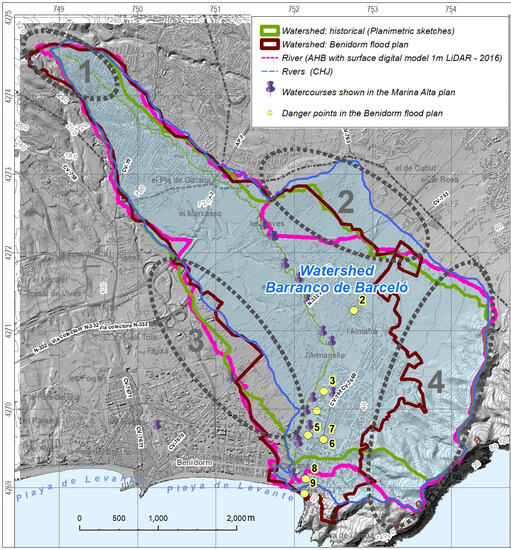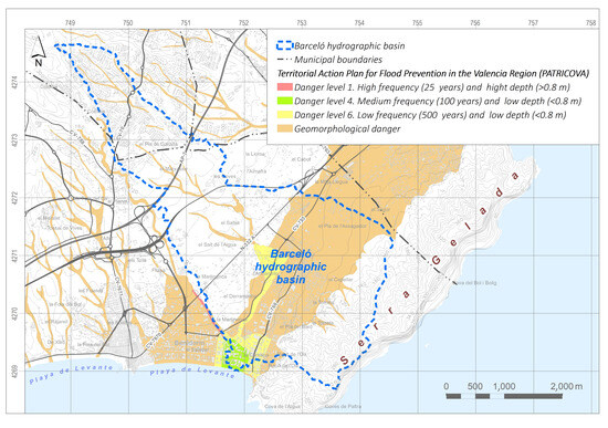 A better understanding of the functioning of these events is necessary so that we can specify appropriate measures. Maps with inappropriate scales cannot be used without considering the transformations made in the basin due to drastic changes in occupation. Measures must be coordinated between all jurisdictions comprising the catchment in order to comply with PATRICOVA specifications, which state that any measure must not increase damage downstream. It would be highly recommended to support research on the behaviour of floods in these channels and how they impact the new urban fabric. Such research deserves to be conducted with a high level of detail. The capture of data from drones and suitable sensors would enable us to greatly improve the geographical information available. This case study of the Barceló basin in Benidorm illustrates a situation that occurs in many other places in the Spanish Mediterranean, and so the results, discussion, and conclusions of this work and future methodological revisions could help alleviate the serious problem of changed ephemeral watercourses caused by rapid urban growth that is found in many areas of the Mediterranean.