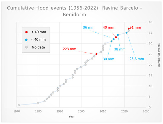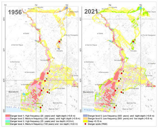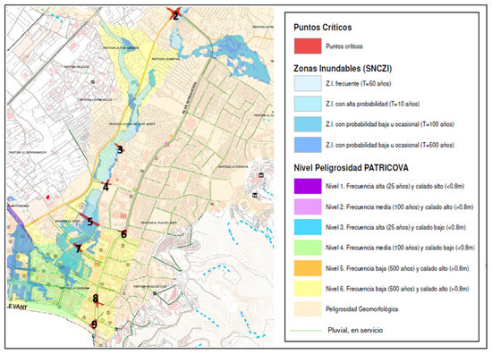 In the municipal action plan for the risk of flooding in Benidorm, approved in 2022 [36], 8 of the 21 danger spots are located within the Barceló ravine (points 2 to 9 out of a total of 21).