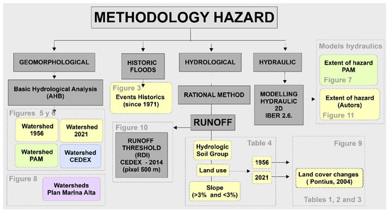 The Runoff Threshold is one of the most sensitive parameters [42] and, in turn, one of the parameters that will have the greatest impact on the results of hazard studies. Therefore, hazards have been calculated by adapting them to the analysis scale of a watershed with small dimensions and deep changes in land use.