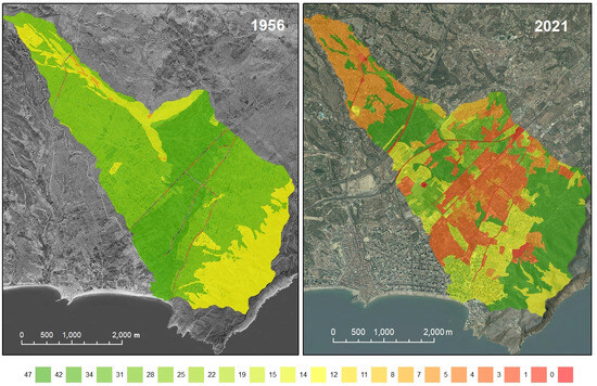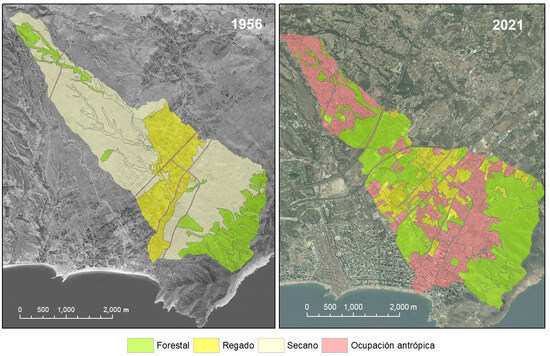 By analysing the intermediate stages between 1956 and 2021 in the historical aerial photographs, we can see that most of these changes occur from 1986 onwards, as can be seen in the 1980–1986 national flight (Instituto Geográfico Nacional). In other words, the change in land use, shown in Table 3, and the catastrophic events have a certain and worrying relationship.