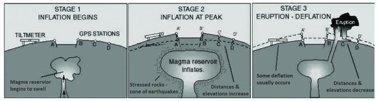 Adaption of a well-known figure of an inflation-to-deflation cycle (courtesy of USGS). Left and centre images: pressurization of a deep magma chamber usually leads to broad and reasonably slow inflation, usually on the time scale of months to multiple years. Magma rise is constrained by the overburden and high lithostatic pressures; as such, the magma body can inflate with no eruption occurring, either stalling or deflating. For magma to reach the surface, it needs a ‘conduit’, usually accomplished by intruding existing cracks or forming new ones. Once the gas-rich magma approaches the surface, lithostatic confining pressure falls and vesiculation (bubbling) will occur, causing a massive increase in pressure and buoyancy; as such, the intrusion can accelerate. This can cause rapid and localized deformation and may culminate in eruptions with short lead times.