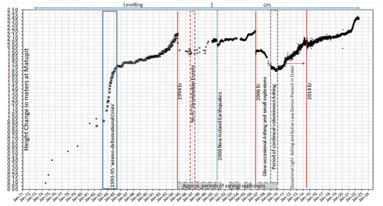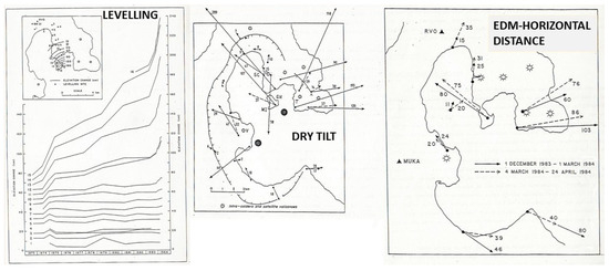 As shown in Figure 5, from the early 1970s onwards the vertical deformation of benchmarks was monitored using traditional levelling techniques. A detailed description of the deformation seen before the 1994 eruption can be found in [9]. During the 1994 and subsequent eruptions, heavy ashfall and frequent mud flows, leading to accumulations of up to 3–4 m in places (a recurring problem until at least 2017), led to many levelling benchmarks being lost or destroyed and made replacement impossible. Civil clean-ups also led to numerous benchmarks being destroyed or disturbed when roads and associated drainages were dugout or graded.