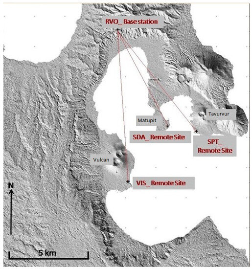 Location map and 1996 infrastructure put in place for the SAGEM system. Rabaul Caldera Real-Time/CORS GPS Sites in red. The infrastructure, with modifications, has been in existence since 1996–1997. Since Jan. 2000 both RVO and SDA have been in almost constant operation. VIS_ and SPT_ have suffered from theft/vandalism on occasions and have long gaps in their data. VIS_ is today still operating; SPT, however, succumbed to coastal erosion in 2021.