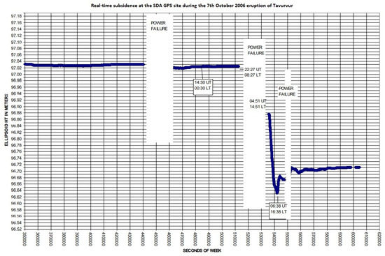 This new system worked almost perfectly, was user friendly and gave good results. Best of all, the system was relatively simple and robust. Figure 8 is an example of actual real-time visual output showing vertical deformation at the SDA_RT site during the hours before, during and after the violent phase of the 7 October 2006 eruption of Tavurvur.