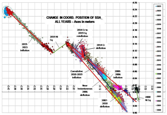 Lat-Lon coordinate wander plot for the SDA GNSS site (2000 to 2023) at the centre of the Rabaul Caldera (movements relative to the RVO Base station). A generally northwestern movement is the norm (red arrows), but with periods of acceleration and periods of relative stability. A near-instantaneous reversal during the 2006 eruption, followed by a near-year-long period of stability, and then a slow SE movement between 2007–2010 (dark and light blue arrows) occurred during a period of sustained ashing, after which the NW movements recommenced. A smaller syn-eruption deflation occurred during the 2014 eruption (dark blue arrow). Marked near-instantaneous offsets can also be seen, caused by the large 2000 and 2019 regional ‘New Ireland earthquakes’ (NI Eq) (green arrows). It is particularly clear that the 2019 regional NI Eq led to a period of accelerating deformation (inflation) starting immediately after the earthquake, and becoming alarming during 2021, with corresponding uplift. In early 2022, stability returned and continues to the date of writing (green ellipse top left).