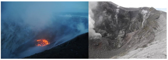 Initial visits to the crater in 2010 revealed a sealed vent, with no emissions other than fumaroles. By early 2011, small high-pressure vents were present which became incandescent by mid-year. A debris-covered dome was present by 2013 (Figure 12). By early 2014, the large dome present in previous visits no longer existed, but smaller uncovered domes were present in a deep hollow where the previous dome had been; these would sometimes lead to an observable night-time glow if low cloud was present. Sub-continuous degassing from the interface of these domes/plugs with the vent material resulted in small dark grey ash emissions being produced, often only noticeable from a distance as a light haze above the vent. Occasional dome disruption would produce heavier ash emissions. This basic pattern of activity during the period of uplift continued until early March 2014, at which point the uplift ceased and a period of stability occurred (visits to the summit showed no real change with small incandescent domes present with ash being winnowed from its interface with the crater floor). The deformational stability remained until the eruption of 29 August, although there was a very slight (~2 cm uplift starting from mid-August). Even though the sub-plinian eruption was powerful, with an ash plume forcefully ejected to a height of 18 km, and large explosions that threw several-meter diameter cow-pat bombs more than a kilometre from the vent, the total subsidence as measured at SDA was only 6–7 cm. Occasional strong explosions continued to 30 August, after which activity reduced to occasional ashing and final cessation. No eruptive activity has taken place at Rabaul since. The huge difference in the scale of deformation between the large 2006 and 2014 eruptions seems to indicate that in 2006 the main chamber was involved, whereas the 2014 eruption may have been just the conduit plug explosively disintegrating, the main chamber by this time being relativity degassed.