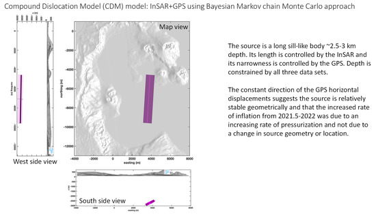A model of a possible inflation source (purple) causing the 2021 to 2022 inflation, derived from the GNSS data, combined with InSAR data, using Bayesian Markov chain Monte Carlo approach [33]. A slide from a talk given at the ‘Cities on Volcanoes 11’ conference, Crete, Greece, 2022.