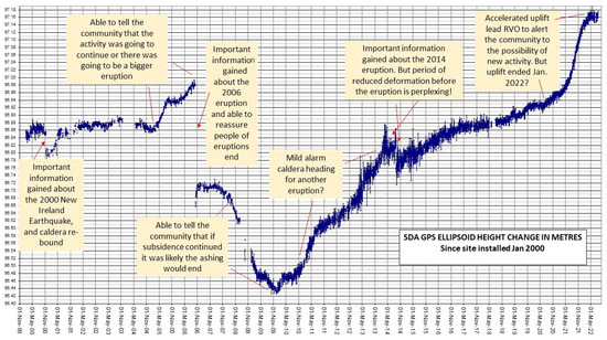 This paper has been written as a narrative history of the use of GPS/GNSS at Rabaul Volcano Observatory, rather than as an in-depth analysis of the data and its systematic application to analytical modelling; to a certain extent, this has been done elsewhere (e.g., [8,13,32,33]). In this narrative context, Figure 14 shows the practical way in which the Observatory has been able to use data produced by this technique to address community questions in realtime. The technique enables simple easily understood answers to be given at any particular point in time, even when other parameters are absent, such as during times of aseismicity and periods of stable gas and thermal readings.