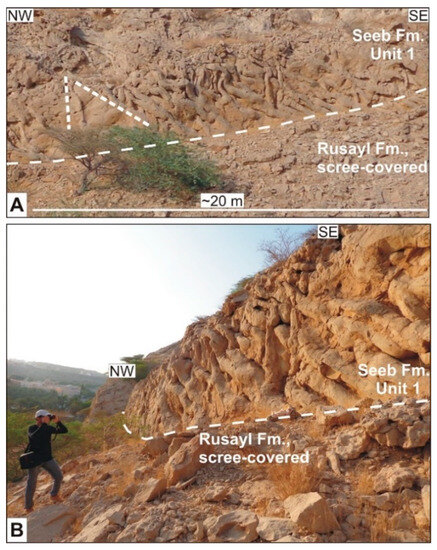 Section 3 is located 4 km to the SE of Section 2 and 2.4 km south of the campus of Sultan Qaboos University. Section 3 is a natural outcrop on a SW-facing slope of a hogback exposing the Rusayl and Seeb formations (arrow 3 in Figure 3; coordinates 23°33′36.34″ N/58°09′50.43″ E). The thickness of Unit 1 here measures almost 29 m.