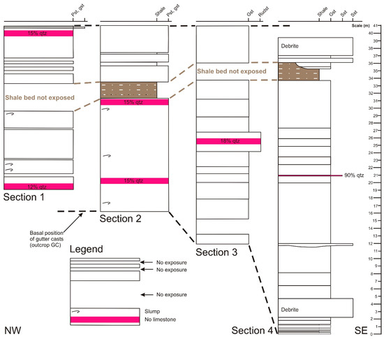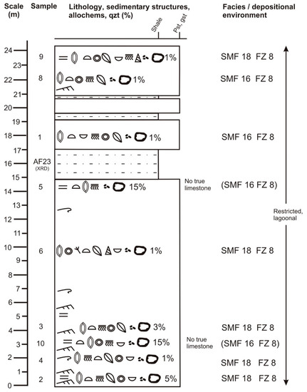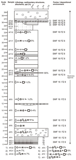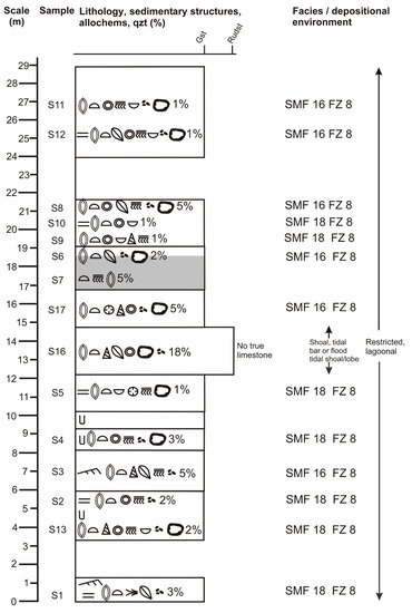 Detailed lithostratigraphic and facies log of Section 2, based on field data and microscopic analyses. Frequency of bioclasts decreases from left to right. Frequency of other allochems also decreases from left to right. Percentages relate to content of detrital quartz. The shale beds at 16 and 19 m above base have been interpreted as terra rossa by Dill et al. [17]. Note that there are only two SMF types! Both represent FZ 8 which is a restricted marine platform interior. The legend is shown in Figure 6.