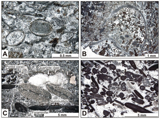 Microphotographs of Section 3 (all PPL). (A) Laminated foraminiferal grainstone from the base of the section with ostracods. The ostracod in the center displays relatively thick-walled valves. The sample is assigned to SMF 18-FOR. Sample S1. (B) Foraminiferal grainstone to rudstone with a small, crushed echinoid test. Arrow 1 marks the flat, basal part of the test while arrow 2 indicates the curved upper part of the test. The lower part became detached from the rest of the test. The sample corresponds to SMF 18-FOR. Sample S2. (C) Foraminiferal grainstone to rudstone, representing SMF 18-FOR. Poritid coral associated with quartzite clast and larger benthic foraminifera (two nummulitids in the center) in the coarse-grained part of Sample S5. Note reworking (abrasion) of the nummulitid on the right! (D) Quartz-foraminiferal rudstone (“rudstone”, if high detrital quartz content would not be considered; no SMF match) with abundant dark, micritic-walled benthic foraminifera. In the center is a gastropod, partly filled with a reworked (abraded) benthic foraminifer. Bioclasts are embedded in displacive sparry calcite cement. Sample S16.