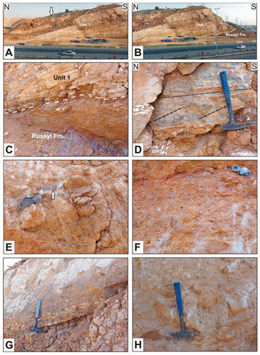 Section 4. (A) Northern and central parts of the outcrop show the shale horizon in the upper part of the section. The pipeline trench is below the road level. Note that shale intruded and tilted overlying beds (arrow)! (B) Central and southern outcrop segment with exposed contact to the underlying Rusayl Formation. (C) Well-exposed abrupt contact between the Rusayl Formation and Unit 1 (base of section). Note the presence of purplish shale in the Rusayl Formation (bottom right), which contains veins with secondary gypsum! The purplish shale always occurs in the middle of the shale bed. (D) Tabular cross-bedding from the middle of Section 4 (21 m above base). Dotted line indicates orientation of general bedding and dashed line indicates orientation of cross-bedding. (E) Debrite with 6 cm long lithoclast, marked by arrow near the base of the section (3 m above base) (F) Reddish monomictic chert conglomerate from the lower half of the section (12 m above base). (G) Conglomerate directly overlying the shale bed (36 m above base). The light-colored clasts are weathered carbonates. (H) Debrite, representing the coarsest sediment of Unit 1 in all four sections from the top of the section (38 m above base).