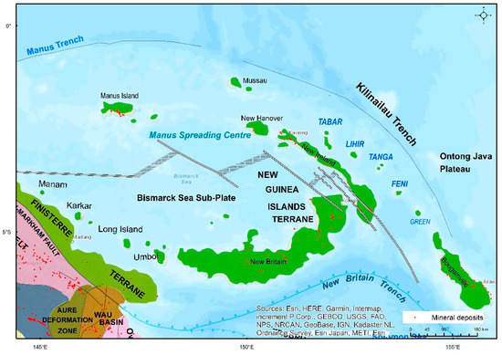 The fourth geotectonic province is the Melanesian Arc, which is situated offshore in the northeast, comprising dismembered island arcs within the segmented Pacific Plate margin and a large igneous province (LIP) termed the Ontong Java Plateau (OJP). It is also referred to as the New Guinea Islands Terrane, consisting of arcuate-shaped islands surrounded by the Bismarck and Solomon seas [1,10]. These island arcs include New Britain, New Ireland, Manus, and Bougainville. Seafloor spreading currently occurs within the Manus Basin, whilst active subduction takes place along the New Britain–San Cristobal Trench [23]. Another important geotectonic element is the mantle plume-generated ~40 km thick Ontong Java Plateau, with an area equivalent to Alaska, situated east of Feni and the TLTF chain. The TLTF chain is located within the Melanesian Arc although its geological history is much younger.