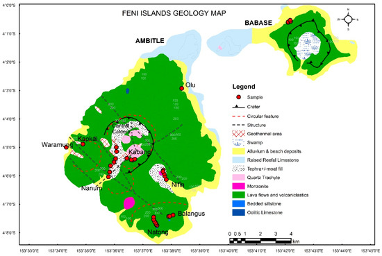 The geology and geothermal activity of the Feni Islands has been documented by various authors [6,49,56,58,59,60,61,62,63,64,65] and numerous Cu-Au exploration companies. This paper gives an overview of both islands in the Feni group with the main focus on the geology and structures of Ambitle Island. The detailed geology of Babase can be gleaned from Wallace et al. [6].