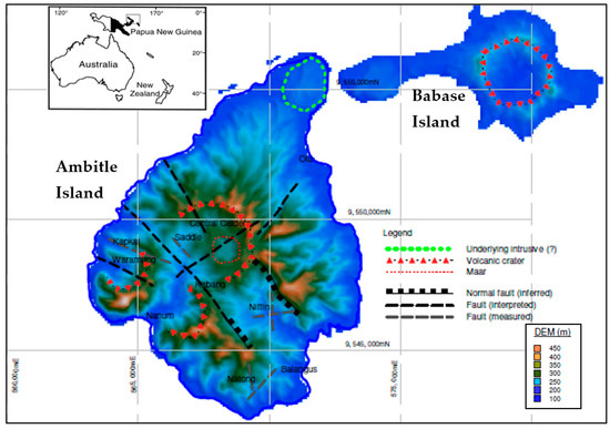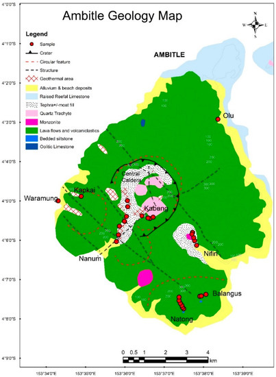 - Lindley, I.D. Late Quaternary geology of Ambitle Volcano, Feni Island Group, Papua New Guinea. Aust. J. Earth Sci. 2015, 62, 529–545. [Google Scholar] [CrossRef]