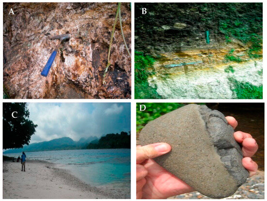 Wallace et al. [6] described Ambitle as a truncated Pliocene–Pleistocene stratovolcano built on a tilted mid–late Oligocene limestone basement (Figure 3). The oldest rock unit on the island is a small outcrop of oolitic limestone containing Oligocene index fossils [6]. The main igneous rock types found throughout the island include basalt and trachyandesite. The volcanic stratigraphy on Ambitle Island consists of an older suite of mafic and intermediate lava and pyroclastic flow deposits, mainly basanite and tephrite [59].