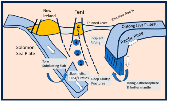 A geotectonic model of the Feni Island Group is presented in Figure 7. Feni is a horst structure within a horst-and-graben extended or rifted crustal–lithospheric setting. It is situated between subducting plates of opposite subduction polarity: the subducting Solomon Sea Plate and the Pacific Plate. The mantle beneath Feni has been modified and metasomatized by numerous geochemical source influences and processes, including a long history of southward subduction at the Kilinailau Trench prior to the Ontong Java Plateau impinging on the subduction zone. This introduced significant quantities of ocean sediment and volatiles. Furthermore, the Solomon Sea Plate is presently subducting at a high angle beneath Feni and could be torn in places (Figure 7). Similarly, the delaminated slab of the older Kilinailau Trench also provides a window for additional melts and fluids from depth. A hotter asthenosphere is introduced into the system as it convects beneath slab edges and or through tears in the subducting slabs. Slab melting could explain the high Sr/Y ratio or adakitic character of some Feni magmas, as noted by Brandl et al. [57]. The extensional setting allows for the creation of magma pathways deep into the lithosphere and incipient local melting linked to rifting. In conclusion, decompression or polybaric melting and crystal fractionation are petrogenetic processes responsible for the evolution of the mafic, intermediate, and felsic igneous rocks of Feni (Figure 7).