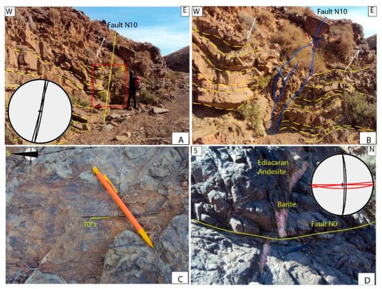 (A) Fault oriented N 45° crosscutting a barite vein hosted in Ediacaran andesite. This fault shows sinistral strike-slip movement. For the stereographic projection, the red planes are for veins and the black ones are for faults (31°22′7.77″ N 5°28′1.86″ W). (B) Fault oriented N 65° displaying dextral strike-slip movement. This fault intersects an ore vein that strikes 90° N. This fault shows dextral movement with a normal component. For the stereographic projection, the red planes are for veins and the black ones are for faults (31°22′10.93″ N 5°27′54.17″ W). (C,D) Google Earth and outcrop photos showing a N 50° -oriented dextral strike-slip fault, affecting Middle Cambrian strata (31°21′18.42″ N 5°22′37.80″ W).