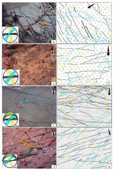 Fracture analysis within ore veins was conducted in various veins, hosted within both Ediacaran volcanic rocks (Figure 6A–F), Lower Cambrian conglomerates (Figure 6G,H), and limestone (Figure 6I,J).