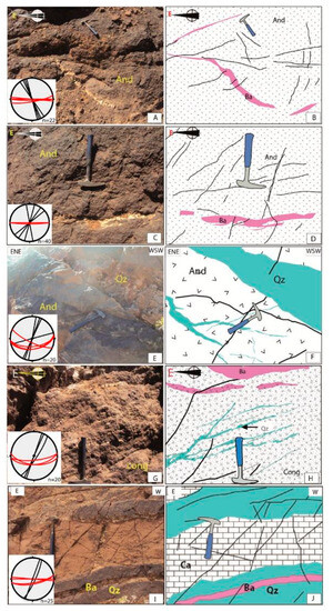 (A–D) Field photographs and their sketches depicting a fracture network cutting barite (Ba) veins, hosted by Ediacaran andesite (And). The coordinates of the photographs are (31°21.882′ N 5°26.766′ W) and (31°21.822′ N 5°26.766′ W), respectively. (E,F) Field photograph and its sketch showing quartz (Qz) veins hosted in Ediacaran andesite (And) (31°22′1.10″ N 5°26′55.68″ W). (G,H) Field photographs and sketches displaying quartz (Qz) and barite (Ba) veins intersected by fractures, hosted in a Lower Cambrian conglomerate (Cong) (31°21.807′ N 5°26.622′ W). (I,J) Field photograph and sketch showing barite (Ba) and quartz (Qz) veins hosted in Lower Cambrian limestone (Ca) (31°21.944′ N 5°27.864′ W). For the stereographic projections, the red planes are for veins, and the black ones are for fractures.