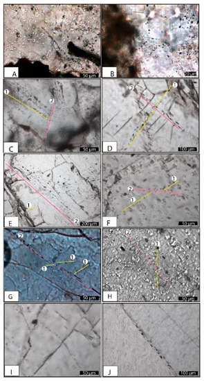 Fluid inclusion planes (FIP) correspond to secondary fluid inclusions that developed after the growth of the crystals. They result from the healing of former open cracks and appear to be fossilized fluid pathways [27,28,29]. The fluid inclusion planes occur in sets and are formed as mode-I cracks materializing the σ1–σ2 plane [30]. They provide valuable information about local paleo-stress in rocks [27] and allow for establishing the relationships between tectonic events and fluid percolations.