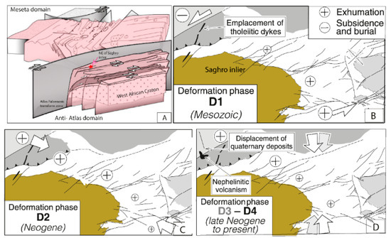 Cerrina Feroni et al. [9] reported fission-track data indicating a post-Variscan evolution of the eastern Anti-Atlas. According to the same authors, four tectonic phases can be recognized: (i) D1 event, which occurred during the Mesozoic and corresponds to a left-lateral transtensional regime described along the Tizi n’Boujou and Bou Larhzazil-Tinifift Faults; (ii) D2 event, which corresponds to a NW-SE-oriented shortening that took place during the Neogene. It was responsible for right-lateral transpressional tectonics documented along the Tizi n’Boujou and Isk n’Izekelli Faults; and (iii) D3 and D4 events, which occurred during the Late Neogene and are still active. These are the result of NNE–SSW- to NNW–SSE-oriented regional shortening (D3 and D4, respectively), which induced remarkable fault reactivation, seismicity, and volcanism.