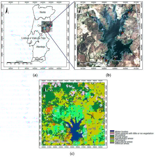 Study area: (a) Portugal and the Sentinel2A imagery tile (29 May 2022); (b) Marateca reservoir’s limit from the LCLU (COS 2018), and the monitoring points (Capt, P1, P2, P3, P4, and P5); and (c) LCLU (COS 2018) around the Marateca reservoir.