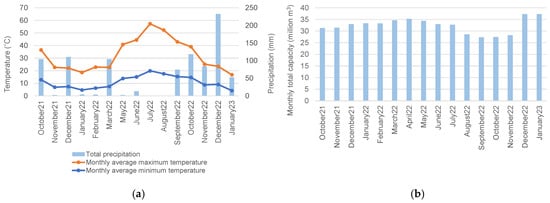 Study area: (a) Castelo Branco climatological station (October 2021–January 2023) data—monthly, average, minimum, and maximum temperatures and total monthly precipitation []; and (b) Marateca reservoir‘s monthly total capacity (million m3) (https://snirh.apambiente.pt/index.php?idMain=2&idItem=3, accessed on 22 March 2023).