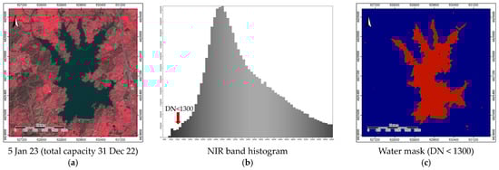 Study area—Marateca reservoir: (a) FCC at total capacity (e.g., 5 Jan 2023—37.2 million m3); (b) near-infrared band (NIR) histogram and threshold for the water mask; and (c) water mask (Boolean).